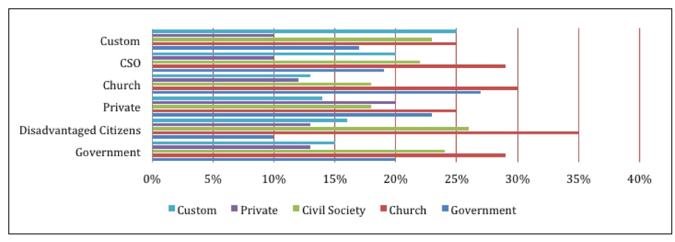 Deciding whom are the ‘authority bearers’. We did not use the common idea of ‘duty bearers’ for this project because –if misused– it dis-empowers. It can imply only the government has the duty to ensure the rights of people. In practice several groups feel a duty and –more importantly– have authority. Putting one group –the government– as the only one with the duty removes responsibility from other actors. This is dangerous in cultures with strong traditional leadership. In these societies current governance models are young vs. traditional systems.