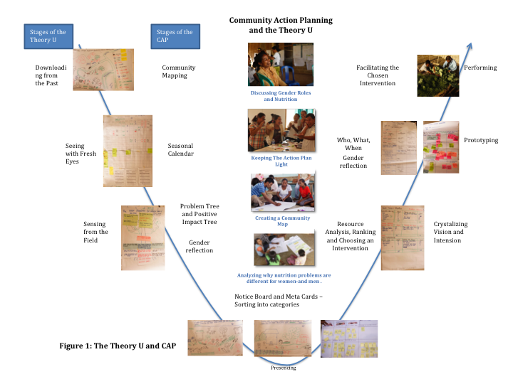 Theory U and Community Action Planning: The Theory U is an ideal guide for community action (See Figure 1).   In any project it is ideal to change methods to fit the context.  As changes are made -to fit the context- the Theory U ensured consistency with action orientation. The tools used for this example were specific to the project.  Tools can be adapted for various action planning purposes.