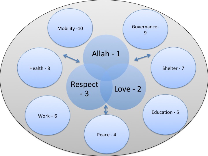 The below figure shows for those surveyed if there is a perceived threat within peoples ability to have faith in Allah, ability to love and help one another, or ability to practice mutual respect they will likely make a capability calculations to preserve these domains. Further the other domains numbers represent their perceived strength.